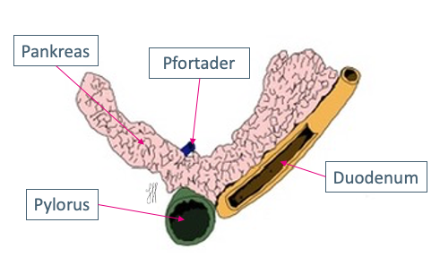Die Bauchspeicheldrüse wird in der Fachsprache auch Pankreas genannt. Die Bauchspeicheldrüse ist ein langes, hellrosa farbenes Organ, das kaudal der Leber im Darmgekröse liegt.